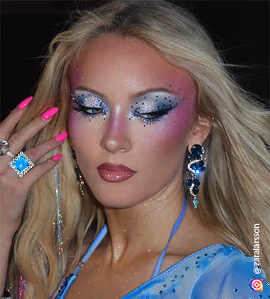 Futuristic beauty is landing in 2026, and it is glowing. Searches for alien-inspired make-up, opalescent skin and soft dewy finishes are climbing fast, and the runways agree. This is glamour with a cosmic edge. Holographic finishes, pearlescent highlights and light-catching textures take centre stage, paired with playful accessories that feel slightly otherworldly. It is ethereal, modern and just strange enough to feel exciting.